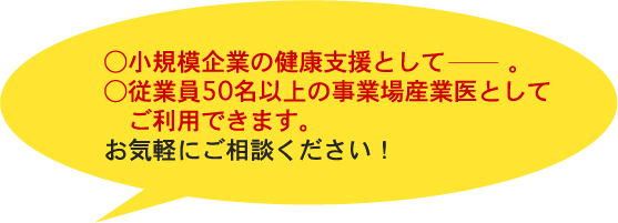 | 【 主な活動 】 ? 働く人の健康に関するサービス機関や制度の紹介 ? 契約した事業所と従業員の健康管理支援・職場巡回健康相談・ 健診後のフォローアップ面談・ 長時間労働者面談・メンタルヘルス対策支援・職場巡視・ 職場安全衛生委員会への出席など、 その他にも働く人の健康管理支援全般を対象にして活動しております。 |